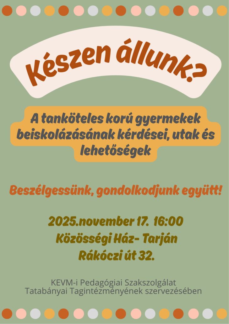 Kedves Szülők! A KEVM-i Pedagógiai Szakszolgálat Tatabányai Tagintézményének szervezésében Bauerné Révészi Mónika előadást tart Készen állunk?–A tanköteles korú gyermekek beiskolázásának kérdései, utak és lehetőségek címmel,