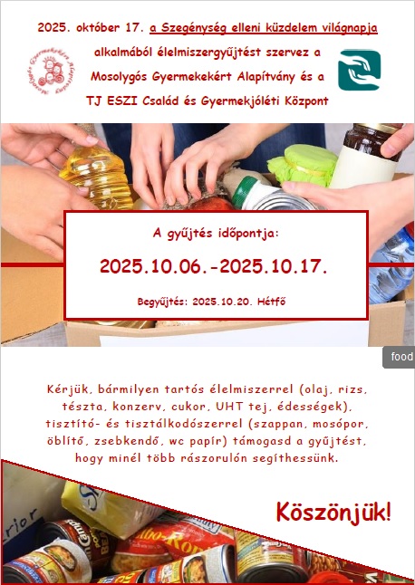 2025. október 17. a Szegénység elleni küzdelem világnapja alkalmából élelmiszergyűjtést szervez aMosolygós Gyermekekért Alapítvány és aTJ ESZI Család és Gyermekjóléti Központ A gyűjtés időpontja:2025.10.06.-2025.10.17.Begyűjtés: 2025.10.20.
