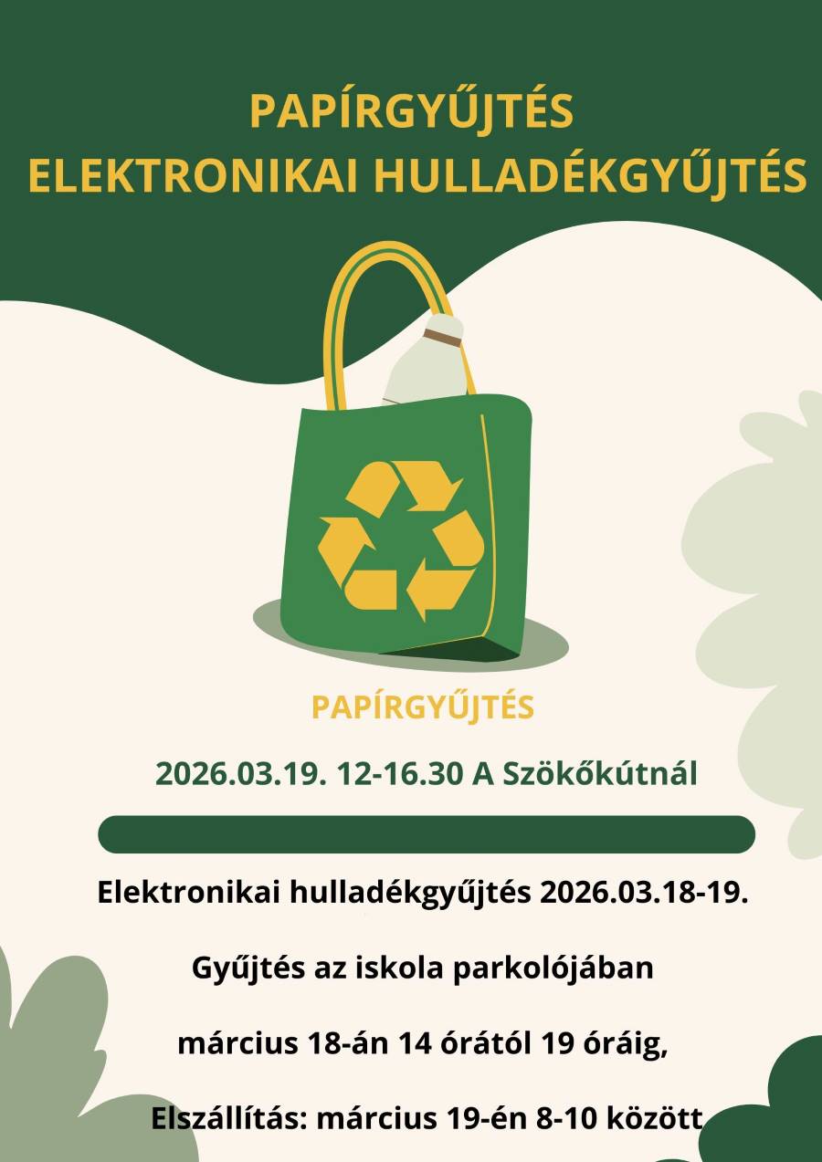 Kedves Szülők! Az idei évben a tavaszi papírgyűjtés időpontja: 2026. március 19. (csütörtök) Helyszín: Szökőkút parkoló A papír leadására:12:30 és 16:30 óra között lesz lehetőség.